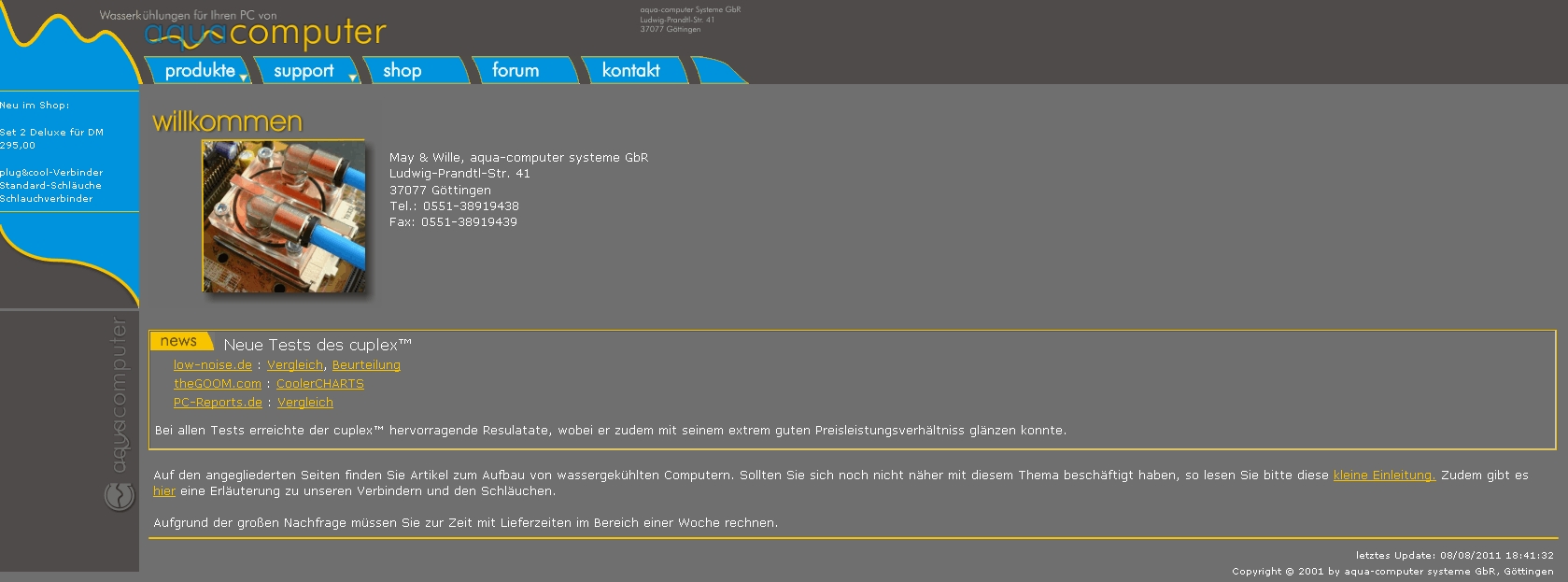 Am 8. August 2001 war es soweit, Aqua Computer eröffnete den Web Shop und setzte mit dem cuplex und den airplex classic neue Standards im Bereich der Wasserkühlung. Der Beginn einer nun 10 Jahre anhaltenden Erfolgsgeschichte die stets Trends gesetzt hat. Unser Ziel war dabei immer eine herausragende Qualität "made in germany" mit hervorragenden technischen Eigenschaften zu verbinden.